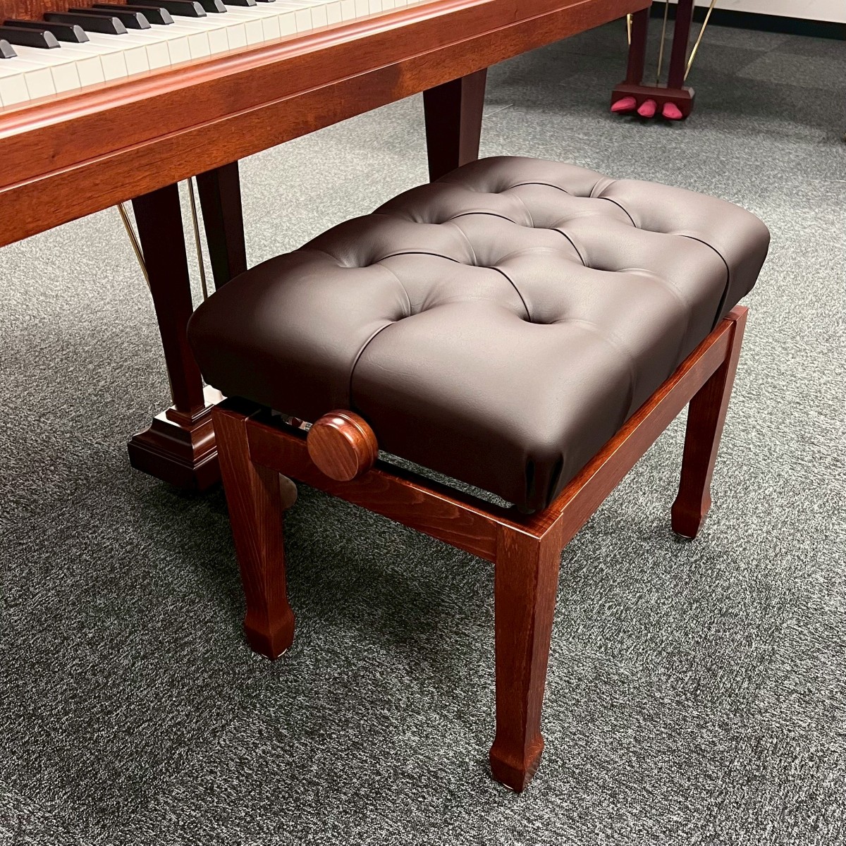 | GL-CAPS 【新品】【人気モデル】 ¥198,000-(税込) (本体価格¥180,000-) ミディアムマホガニー 艶出し仕上げ 座面 ブラウン/フェイクレザー 脚 笠脚 ガススプリング式 寸法 幅57x奥行42x高さ47~57 cm コンサート仕様の椅子をコンパクトなサイズ感に。ご自宅でお楽しみいただけます。 キルティングシートとエンパイアスタイルの脚を備えたスタイリッシュなデザインです。 ガススプリング式のためハンドルを回さずに速やかに昇降でき、演奏中の軋みが無く快適な座り心地です。 |